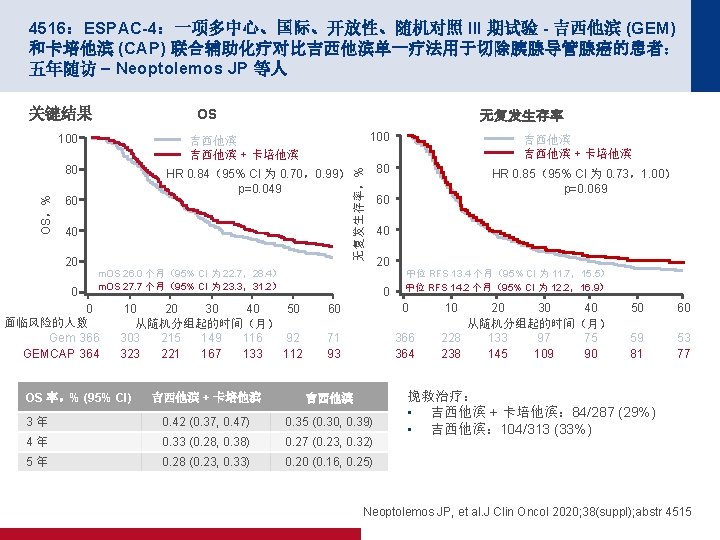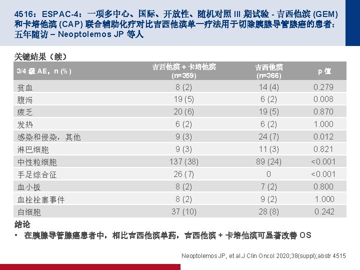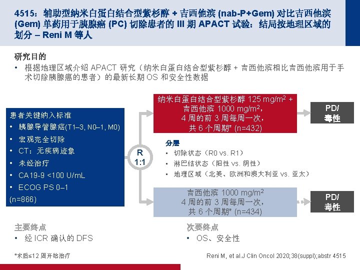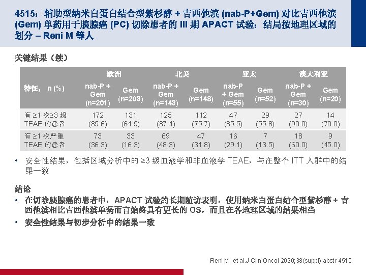 4515:辅助型纳米白蛋白结合型紫杉醇 + 吉西他滨 (nab-P+Gem) 对比吉西他滨 (Gem) 单药用于胰腺癌 (PC) 切除患者的 III 期 APACT 试验:结局按地理区域的 划分 – Reni M 等人 关键结果 OS(ITT 人群) 100 事件/n 中位数(月) nab-P + Gem 248/432 41. 8 Gem 263/434 37. 7 HR 0. 82(95% CI 为 0. 687,0. 973) 80 OS,% p=0. 0232 60 40 随访中位数(月) (基线时的 n) nab-P + Gem Gem 欧洲 53. 9 (203) 53. 2 (205) 44 41 北美 53. 9 (144) 52. 6 (156) 44 37 亚太 51. 1 (55) 52. 7 (53) 46 39 澳大利亚 50. 6 (30) 54. 2 (20) 42 26 ITT 共计 53. 3 (432) 53. 0 (434) 44 38 20 0 0 3 面临风险的人数 6 4 年 OS,% 9 12 15 18 21 24 27 30 33 36 39 42 45 48 51 54 57 60 63 时间(月) 432 427 420 406 385 366 344 307 284 264 252 232 220 207 198 186 144 110 75 53 26 14 434 415 404 384 354 320 301 275 262 249 228 212 202 181 165 154 121 100 64 37 15 5 Reni M, et al. J Clin Oncol 2020; 38(suppl); abstr 4515