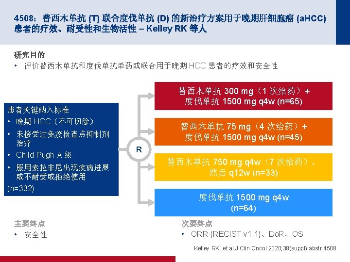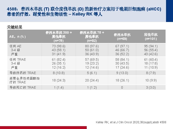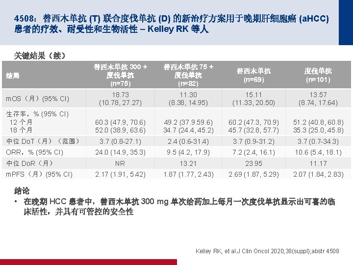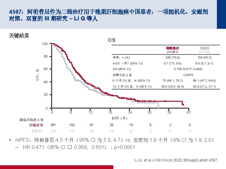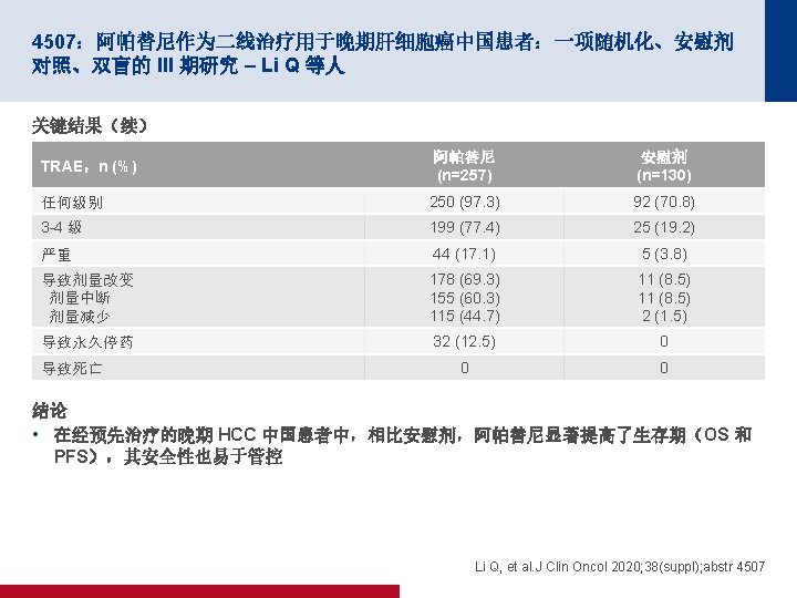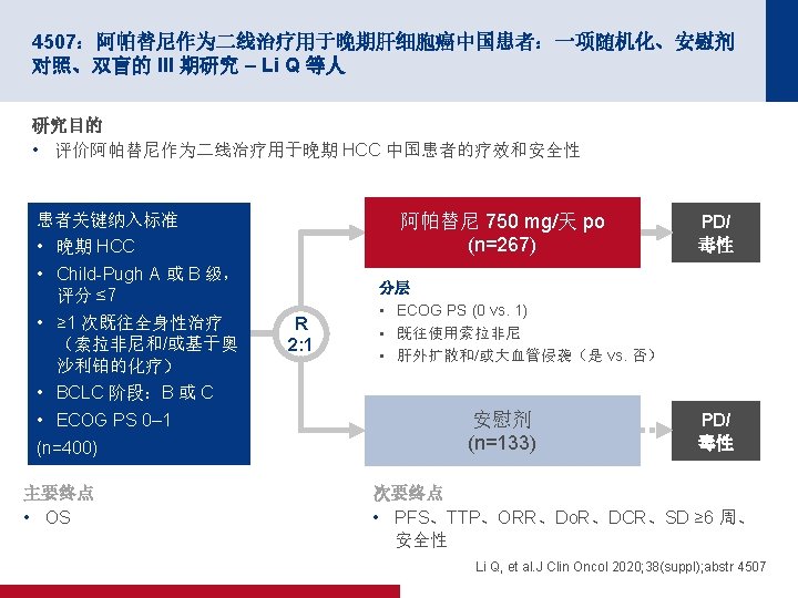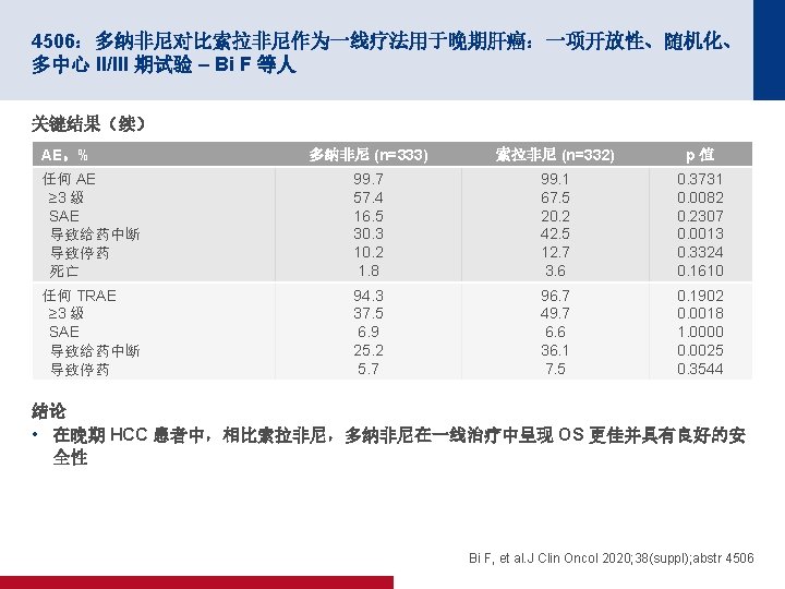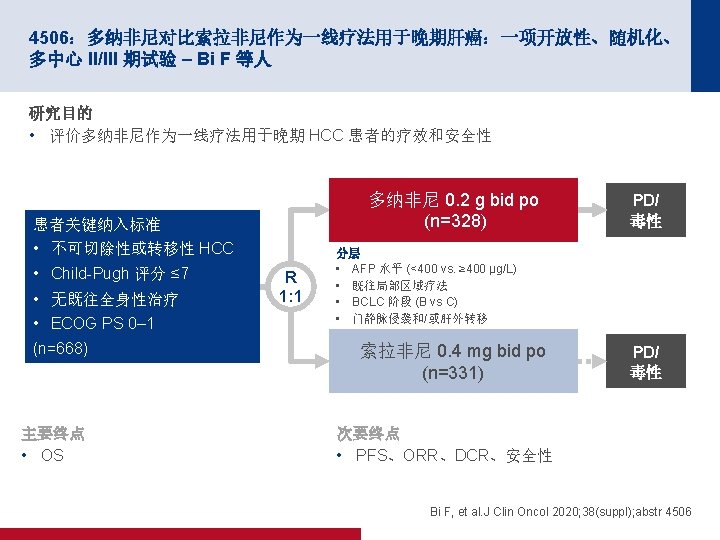 4506:多纳非尼对比索拉非尼作为一线疗法用于晚期肝癌:一项开放性、随机化、 多中心 II/III 期试验 – Bi F 等人 关键结果 结局 多纳非尼 (n=328) 索拉非尼 (n=331) ORR,n (%) [95% CI] 15 (4. 6) [2. 6, 7. 4] 9 (2. 7) [1. 3, 5. 1] CR 1 (0. 3) 0 PR 19 (5. 8) 12 (3. 6) SD 163 (49. 7) 166 (50. 2) PD 122 (37. 2) 124 (37. 5) NE 23 (7. 0) 19 (8. 8) DCR,n (%) [95% CI] 101 (30. 8) [25. 8, 36. 1] 95 (28. 7) [23. 9, 33. 9] 第 24 周 DCR,n (%) 68 (20. 7) 52 (15. 7) m. PFS(月)(95% CI) 3. 7 (3. 0, 3. 7) 3. 6 (2. 4, 3. 7) BOR,n (%) HR (95% CI);p 值 0. 909 (0. 763,1. 082); 0. 2824 Bi F, et al. J Clin Oncol 2020; 38(suppl); abstr 4506