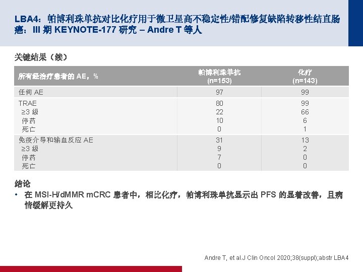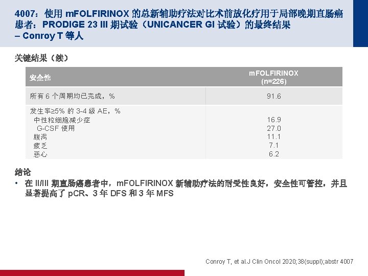 4007:使用 m. FOLFIRINOX 的总新辅助疗法对比术前放化疗用于局部晚期直肠癌 患者:PRODIGE 23 III 期试验(UNICANCER GI 试验)的最终结果 – Conroy T 等人 关键结果(续) 整体健康状况/Qo. L 100 HRQo. L 评分 80 60 40 m. FOLFIRINOX CRT 20 0 0 12 24 36 48 60 时间(月) • m. FOLFIRINOX 和 CRT 组的整体健康状况随着时间的推移有所改善 (p<0. 001) – ��有利于 m. FOLFIRINO,p=0. 076 Conroy T, et al. J Clin Oncol 2020; 38(suppl); abstr 4007