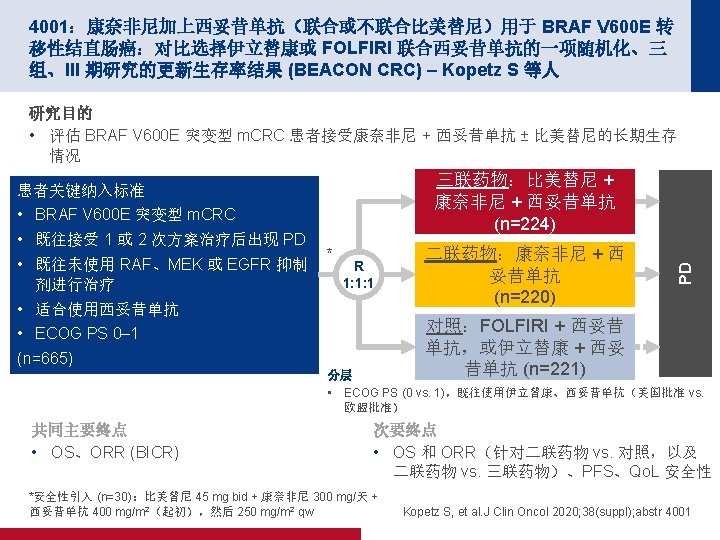 4001:康奈非尼加上西妥昔单抗(联合或不联合比美替尼)用于 BRAF V 600 E 转 移性结直肠癌:对比选择伊立替康或 FOLFIRI 联合西妥昔单抗的一项随机化、三 组、III 期研究的更新生存率结果 (BEACON CRC) – Kopetz S 等人 关键结果 OS(更新的) 三联药物 vs. 对照 亚组 所有患者 二联药物 vs. 对照 事件/患者的数量 294/445 HR (95% CI) 0. 60 (0. 47, 0. 75) 事件/患者的数量 285/441 HR (95% CI) 0. 61 (0. 48, 0. 77) 134/227 160/218 0. 62 (0. 44, 0. 87) 0. 56 (0. 41, 0. 77) 122/225 163/216 0. 49 (0. 34, 0. 71) 0. 70 (0. 51, 0. 95) 既往使用伊立替康 否 是 145/219 149/226 0. 54 (0. 39, 0. 75) 0. 65 (0. 47, 0. 90) 143/216 142/225 0. 51 (0. 36, 0. 71) 0. 71 (0. 51, 0. 99) 既往接受转移性疾病 1 治疗方案的次数 ≥ 2 180/291 114/154 0. 57 (0. 42, 0. 77) 0. 62 (0. 43, 0. 89) 182/291 103/102 0. 60 (0. 45, 0. 81) 0. 61 (0. 41, 0. 90) 年龄 <65 ≥ 65 190/290 104/155 0. 61 (0. 45, 0. 81) 0. 56 (0. 38, 0. 82) 177/286 108/155 0. 56 (0. 42, 0. 76) 0. 65 (0. 44, 0. 95) 性别 男性 女性 141/199 153/246 0. 64 (0. 46, 0. 89) 0. 55 (0. 40, 0. 76) 135/208 150/233 0. 57 (0. 41, 0. 80) 0. 64 (0. 46, 0. 88) 146/236 145/209 0. 64 (0. 46, 0. 89) 0. 53 (0. 38, 0. 73) 137/240 148/201 0. 48 (0. 34, 0. 68) 0. 76 (0. 54, 1. 05) MSI 状态 异常,高 正常 22/34 204/299 0. 70 (0. 29, 1. 57) 0. 52 (0. 39, 0. 69) 18/31 200/304 0. 74 (0. 29, 1. 89) 0. 48 (0. 36, 0. 64) 基线 CEA >ULN ≤ULN 254/357 39/87 0. 60 (0. 47, 0. 77) 0. 47 (0. 25, 0. 89) 233/331 51/109 0. 66 (0. 51, 0. 86) 0. 61 (0. 35, 1. 07) 基线 CRP >ULN ≤ULN 152/185 134/287 0. 58 (0. 42, 0. 80) 0. 56 (0. 40, 0. 79) 145/169 134/265 0. 77 (0. 55, 1. 07) 0. 53 (0. 38, 0. 75) 95/147 165/245 0. 56 (0. 38, 0. 85) 0. 67 (0. 49, 0. 91) 95/151 147/229 0. 57 (0. 38, 0. 85) 0. 65 (0. 47, 0. 90) 168/255 126/190 0. 62 (0. 45, 0. 83) 0. 39 (0. 49, 0. 80) 150/245 135/196 0. 54 (0. 39, 0. 75) 0. 69 (0. 49, 0. 97) ECOG PS 0 1 涉及的器官数目 ≤ 2 ≥ 3 肿瘤侧面 结肠左侧 结肠右侧 肿瘤切除状态 完全切除 部分/未切除 0. 1 0. 2 0. 5 1. 0 2. 0 ENCO/CETUX 组更好 对照组更好 0. 1 0. 2 0. 5 1. 0 2. 0 ENCO/BINI/CETUX 组更好 对照组更好 • m. OS(月)(95% CI):三联药物 9. 3 (8. 2,10. 8);二联药物 9. 3 (8. 0,11. 3);对照 5. 9 (5. 1,7. 1) – HR (95% CI):三��物 vs. 二��物 0. 95 (0. 74, 1. 21) Kopetz S, et al. J Clin Oncol 2020; 38(suppl); abstr 4001