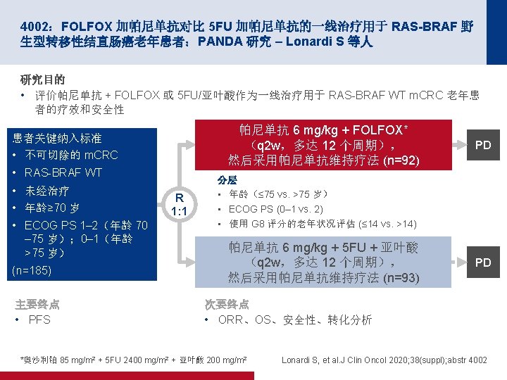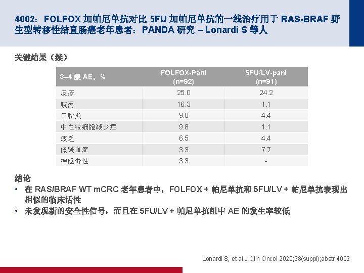 4002:FOLFOX 加帕尼单抗对比 5 FU 加帕尼单抗的一线治疗用于 RAS-BRAF 野 生型转移性结直肠癌老年患者:PANDA 研究 – Lonardi S 等人 关键结果 PFS 100 80 事件,n (%) PFS,% m. PFS(月)(95% CI) 60 p值 FOLFOX-pani (n=91) 5 FU/LV-pani (n=92) 72 (79. 1) 78 (84. 8) 9. 6 (8. 8, 10. 9) 9. 1 (7. 7, 9. 9) <0. 001 40 20 随访中位数: 20. 5 个月 0 面临风险的人数 FOLFOX-Pani 5 FU/LV-pani • • 0 6 91 92 68 64 12 29 25 18 24 时间(月) 11 10 2 2 30 36 42 0 1 0 0 FOLFOX-pani: ORR 65%(95% CI 为 54, 74);DCR 88%(95% CI 为 79, 94) 5 FU/LV-pani:ORR 57%(95% CI 为 46, 67);DCR 86%(95% CI 为 77, 92) Lonardi S, et al. J Clin Oncol 2020; 38(suppl); abstr 4002