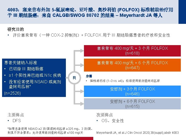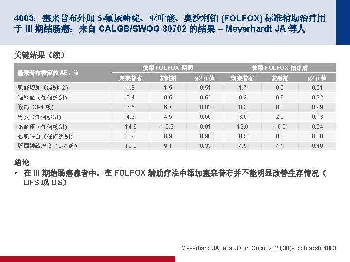 4003:塞来昔布外加 5 -氟尿嘧啶、亚叶酸、奥沙利铂 (FOLFOX) 标准辅助治疗用 于 III 期结肠癌:来自 CALGB/SWOG 80702 的结果 – Meyerhardt JA 等人 关键结果 DFS 100 80 塞来昔布 安慰剂 60 40 20 事件/总数 3 年 DFS (95% CI) 塞来昔布* 326/1265 76. 3 (73. 8, 78. 8) 安慰剂* 352/1261 73. 4 (70. 8, 76. 0) 无事件,% 80 HR (95% CI) 60 40 0. 90 (0. 77, 1. 04); p=0. 1587 20 3 年 DFS (95% CI) HR (95% CI) 塞来昔布(6 个月) 77. 0 (73. 6, 80. 6) 0. 94 (0. 75, 1. 16) 塞来昔布(3 个月) 75. 5 (72. 0, 79. 1) 0. 99 (0. 80, 1. 23) 安慰剂(6 个月) 75. 0 (71. 4, 78. 7) 参考值 安慰剂(3 个月) 71. 9 (68. 3, 75. 7) 1. 14 (0. 92, 1. 41) 分层的 p 值: 0. 2818 0 0 0 1 面临风险的人数 1265 1049 1261 *合并分析 1041 2 3 4 自随机分组以来的年数 5 6 0 1 647 618 615 646 534 515 506 535 894 768 633 384 109 846 738 608 370 102 2 3 4 自随机分组以来的年数 450 444 411 435 355 383 360 378 320 313 290 318 5 188 196 178 192 6 54 55 46 56 Meyerhardt JA, et al. J Clin Oncol 2020; 38(suppl); abstr 4003