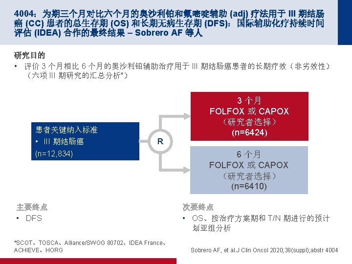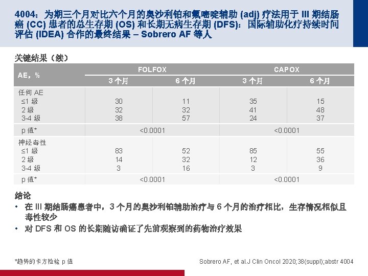 4004:为期三个月对比六个月的奥沙利铂和氟嘧啶辅助 (adj) 疗法用于 III 期结肠 癌 (CC) 患者的总生存期 (OS) 和长期无病生存期 (DFS):国际辅助化疗持续时间 评估 (IDEA) 合作的最终结果 – Sobrero AF 等人 关键结果(续) 5 年 OS, % (95% CI) OS(按亚组) 3 个月 (n=249) 6 个月 (n=250) HR* (95% CI) 治疗方案 CAPOX FOLFOX 82. 1 (80. 5, 83. 6) 82. 6 (81. 3, 83. 8) 81. 2 (79. 7, 82. 9) 83. 8 (82. 6, 85. 0) 0. 96 (0. 85, 1. 08) 1. 07 (0. 97, 1. 18) 风险组 低风险 (T 1 -3, N 1) 高风险 (T 4, N 2) 89. 6 (88. 6, 90. 7) 72. 0 (70. 3, 73. 8) 88. 9 (87. 8, 90. 0) 74. 1 (72. 4, 75. 9) 0. 95 (0. 84, 1. 08) 1. 08 (0. 98, 1. 19) 治疗方案/风险 CAPOX,低风险 CAPOX,高风险 FOLFOX,低风险 FOLFOX,高风险 90. 4 (88. 9, 92. 0) 71. 4 (68. 7, 74. 2) 89. 1 (87. 8, 90. 5) 72. 5 (70. 2, 74. 9) 88. 1 (86. 3, 89. 8) 72. 4 (69. 7, 75. 2) 89. 4 (88. 1, 90. 7) 75. 3 (73. 1, 77. 6) 0. 85 (0. 69, 1. 04) 1. 03 (0. 89, 1. 20) 1. 02 (0. 87, 1. 19) 1. 12 (0. 98, 1. 27) *3 个月 vs. 6 个月 Sobrero AF, et al. J Clin Oncol 2020; 38(suppl); abstr 4004