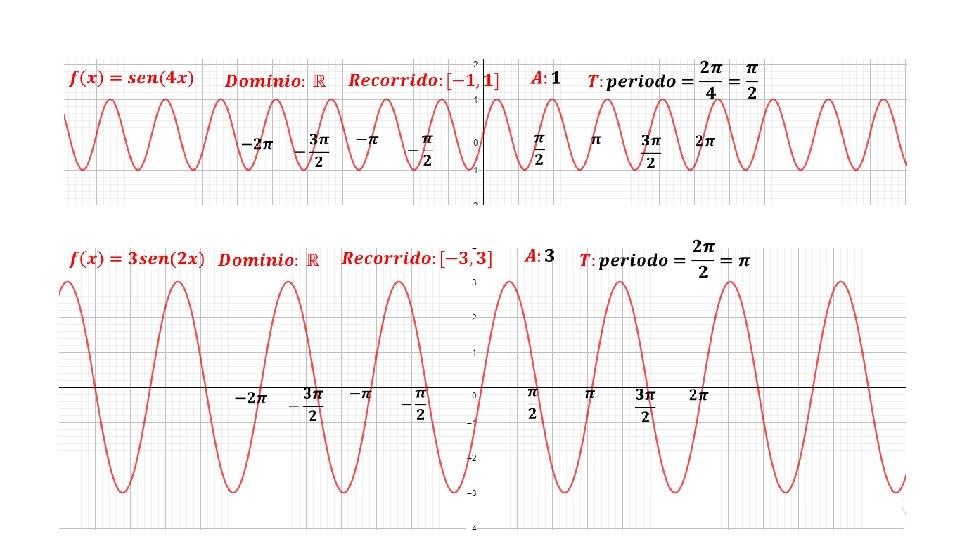 ACTIVIDAD GRUPAL: En un archivo PPT, crear una portada con el logo del colegio, título de la unidad, nombre y apellido de integrantes y de la profesora, curso y fecha de entrega del PPT al correo de la profesora. 1) Responder mediante la función “INSERTAR: Audio: Grabar audio o audio en mi PC”. El nombre del archivo debe ser: TAREA 2_apellido 1_apellido 2_apellido 3_apellido 4_apellido 5. Enviarlo al correo: danielanataliaaraya@gmail. com antes de la próxima clase. TODOS LOS INTEGRANTES DEDEN RESPONDER AL MENOS 1. 1) ¿Qué sucede con las funciones seno y coseno cuando A varía? Ejemplifica. 2) ¿ Qué sucede con el recorrido de la función seno y coseno de amplitud A=1, cuando k varía? 3) ¿Qué sucede con el periodo de la función seno y coseno de amplitud A=1, cuando k>1? 4) ¿¿Qué sucede con el periodo de la función seno y coseno de amplitud A=1, cuando 0<k<1? 5) Graficar manualmente las siguientes funciones, en el intervalo. Indicar en radianes el periodo para máx. , ceros y mín. Tomar una foto y pegar en una diapositiva cada función. Insertar audio para el Dominio y recorrido de cada una.