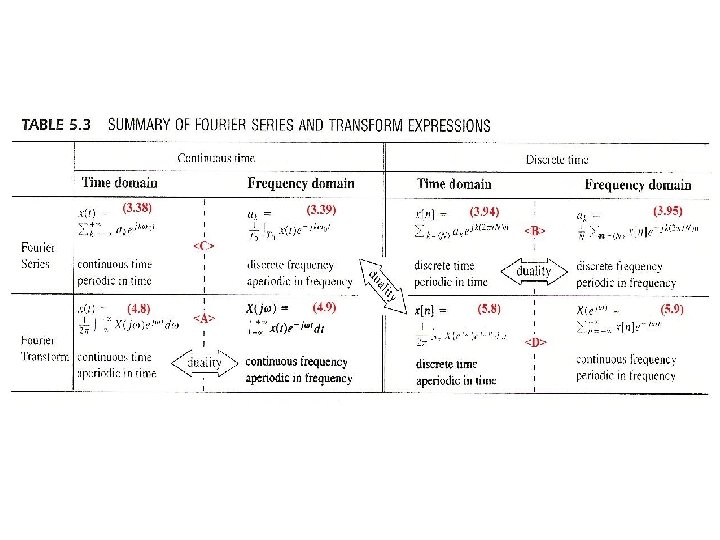Duality<C> / <D> For <C> For <D> Duality – taking z(t) as a periodic signal in time with period 2 , substituting into (3. 38), ω0 = 1 which is of exactly the same form of (5. 9) except for a sign change, (3. 39) indicates how the coefficients ak are obtained, which is of exactly the same form of (5. 8) except for a sign change, etc. See Table 5. 3, p. 396 of text