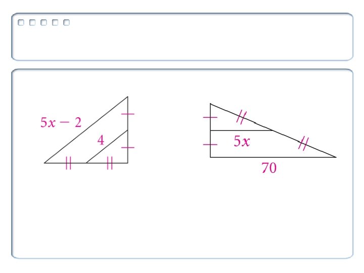 Example 10 Explain why the choice of variables below might be slightly more convenient. Given: MS is a midsegment of ΔOWL Prove: MS || OL and MS = ½OL