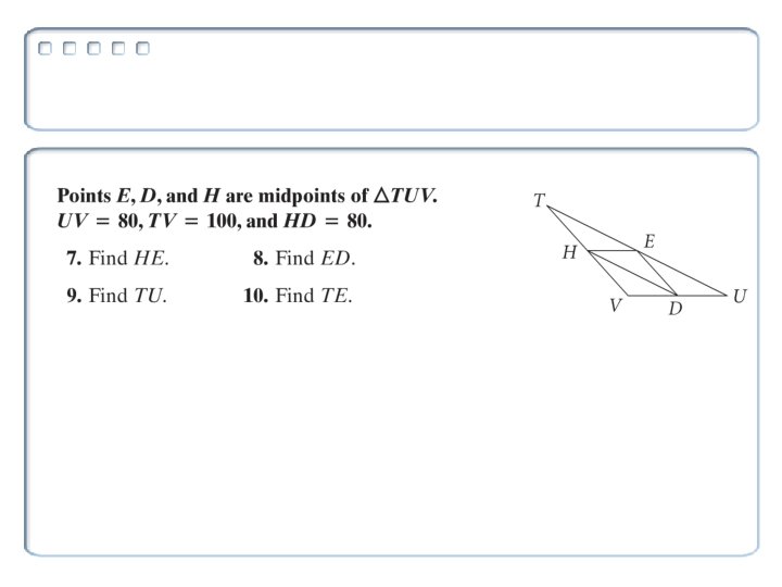 Example 2 The diagram shows an illustration of a roof truss, where UV and VW are midsegments of ΔRST. Find UV and RS.