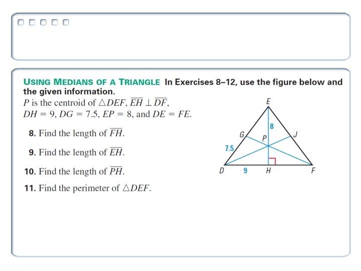 Concurrency of Medians Theorem The medians of a triangle intersect at a point that is twothirds of the distance from each vertex to the midpoint of the opposite side.
