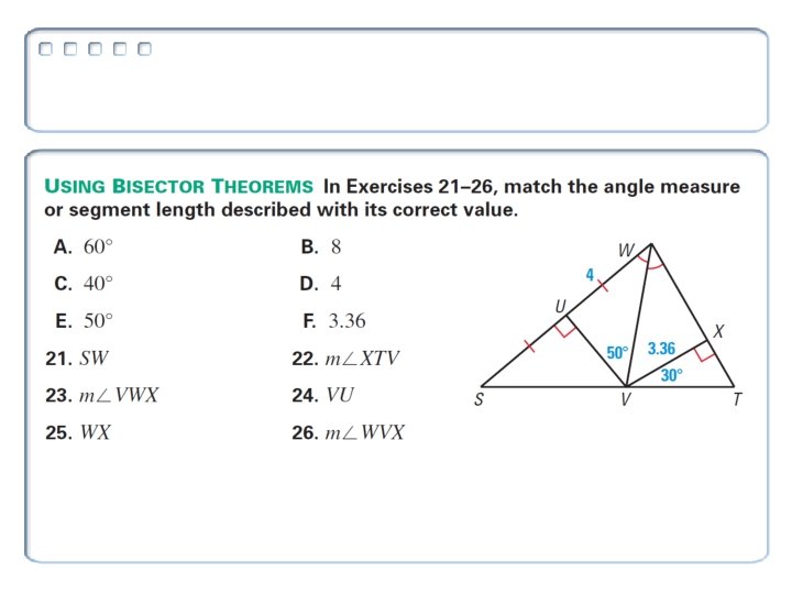 Example 6 Find the measure of <GFJ. It’s not the Angle Bisector Theorem that could help us answer this question. It’s the converse. If it’s true.