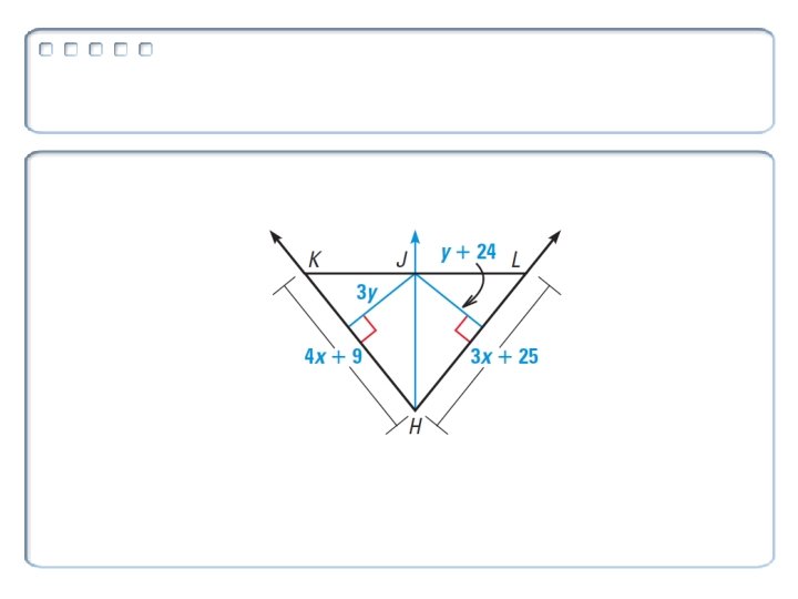 Example 4 A soccer goalie’s position relative to the ball and goalposts forms congruent angles, as shown. Will the goalie have to move farther to block a shot toward the right goal post or the left one?