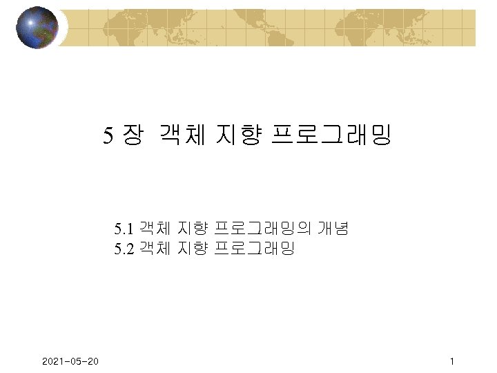 객체 지향 프로그래밍 5. 2 객체 지향 프로그래밍 v Car 클래스의 정의 ‘Car(자동차) 클래스 Public Class Car. . . End Class v 클래스의 속성을 필드(field)로 구현 Public Class Car Dim My. Field As Long. . . End Class '필드 멤버 v 클래스의 행위는 메소드 구현 Public Class Car Dim My. Field As Long Sub My. Method( ). . . End Sub End Class 2021 -05 -20 '필드 멤버 '메소드 구현 코드 20