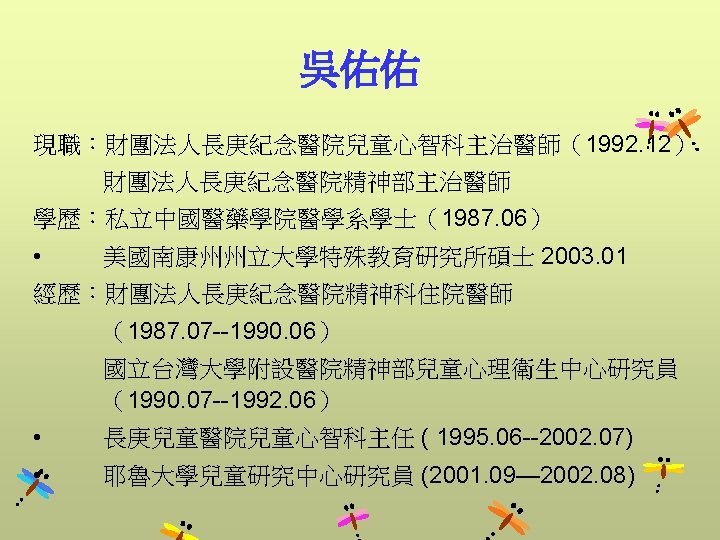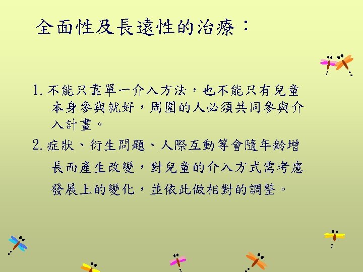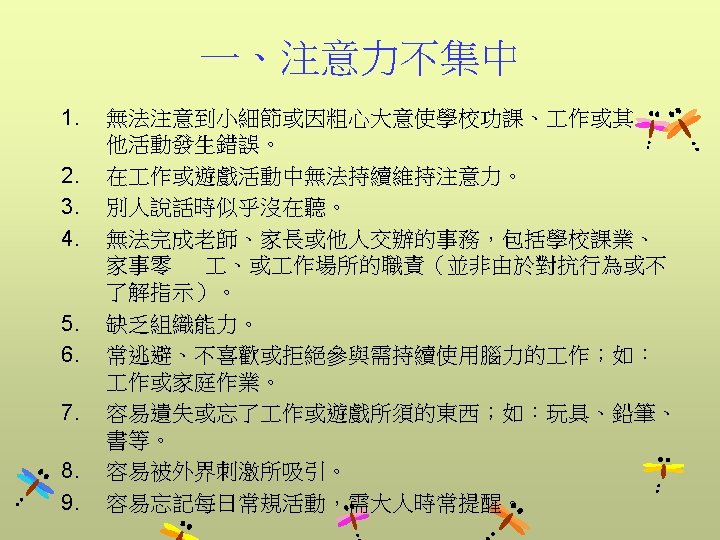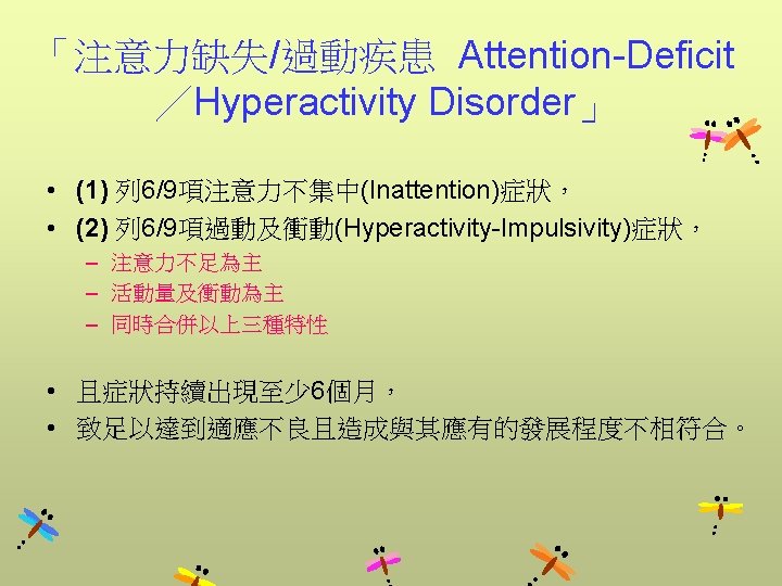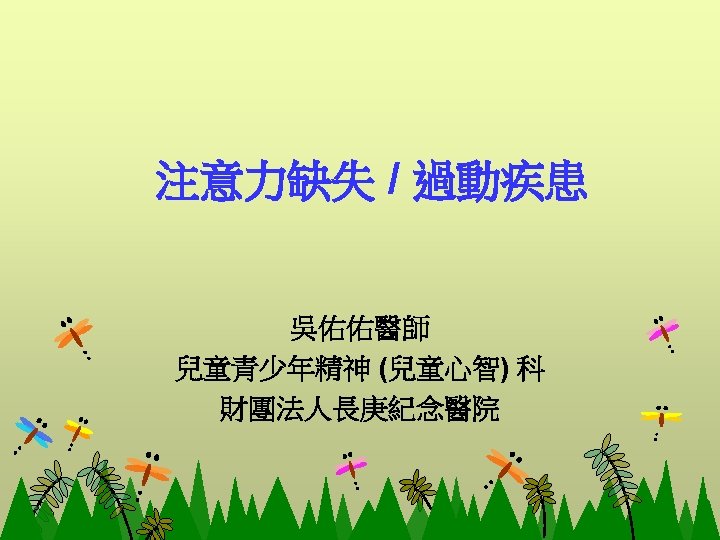 流行病學 • • • 高淑芬 (2004): 7. 5 -3. 8% in G 7 -9 國中學生 Hou (2003): 6. 4% 國小學童 Tzang (2002): 8. 4 -11. 7% 國小學童 趙家琛 (1998): 7. 5 -9% 小三 四國小男童 Leung (1996): 8. 9% 香港學童 • 6 -9% US 5 -12 y/o children, 60 -80% functionally impairing symptoms into adolescence and 50% into adulthood. Pliszka 2007 • National comorbidity survey, 3199 adults (19 -44) 4. 4%. Kessler 2006