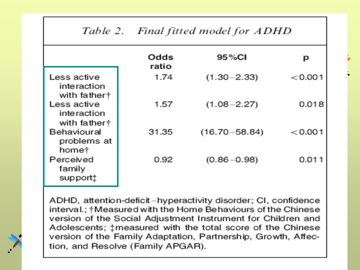 Relationship of attention-deficit-hyperactivity disorder symptoms, depressive/anxiety symptoms, and life quality in young men • 929 draftees into the Taiwanese army – – – Adult ADHD Self-Report Scale (ASRS), WHO: Quality of Life-Brief Version, Epworth Sleepiness Scale, Beck Depression Inventory-II, Beck Anxiety Scale. • 328 adults (35. 3%) identified as having ADHD: – 65 (7. 0%) with definite ADHD and – 263 (28. 3%) with probable ADHD • More severe depressive, anxiety symptoms and daytime sleepiness, and had poorer quality of life than the 601 controls (all P < 0. 05). Chao CY, Psychiatry Clin Neurosci. 2008 Aug; 62(4): 421 -6
