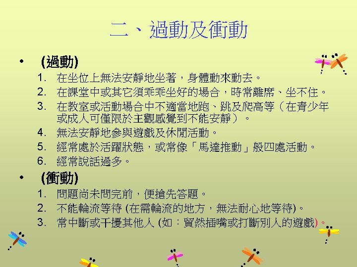 Emotional problems • Low self-esteem 低自尊 • Self-perception of incompetence 自覺無能力 • 焦慮 – 27 -30% met criteria for an anxiety disorder (Biderman 1991) – 28% of preschooler, 22% of school-age children (Wilens 2002) • 憂鬱 – 25 -30% of children with ADHD