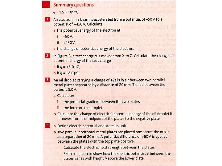 The electric potential at point P: Vp = Ep Q So electric potential energy Ep = Vp Q electric potential energy of a 1ųC test charge moving from infinity to where the potential is 1000 V ( work done in moving this charge from infinity to point P) Ep = Vp Q Ep = 1000 x 1ųC Ep = 1 m. J 1000 V Electric Potential P + 1ųC + + + r oo Zero Potential energy at oo