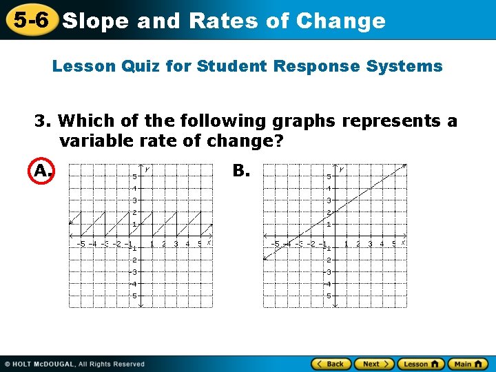5 -6 Slope and Rates of Change Lesson Quiz for Student Response Systems 3. Which of the following graphs represents a variable rate of change? A. B.