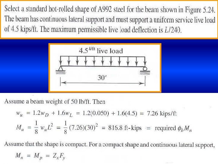 Example 5. 12 Use A 992 steel and select a rolled shape for the beam shown below. The concentrated load is a service live load, and the uniform load is 30% dead load and 70% live load. Lateral bracing is provided at the ends and at mid span. There is no restriction on deflection.