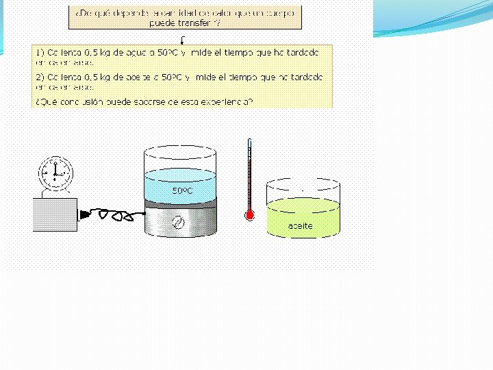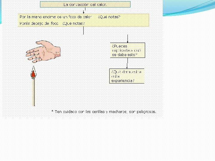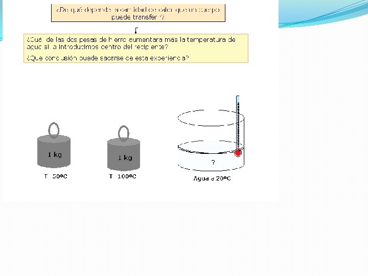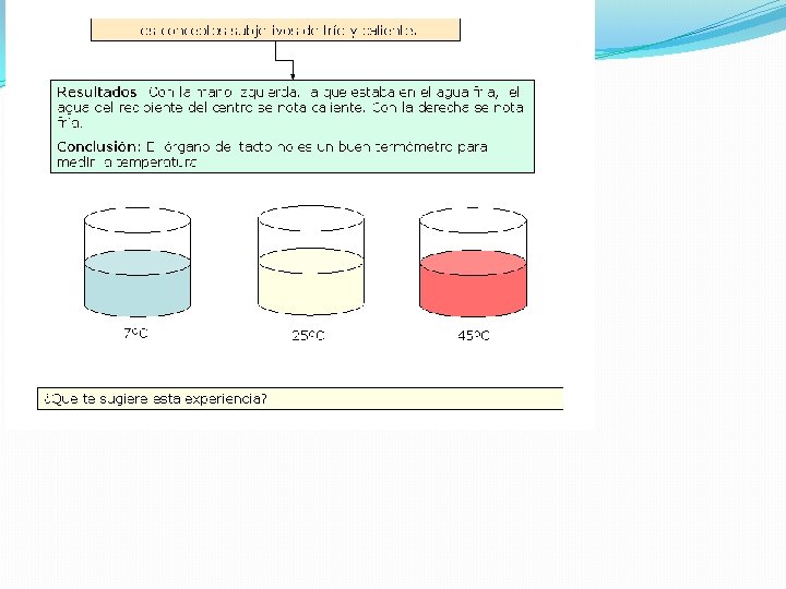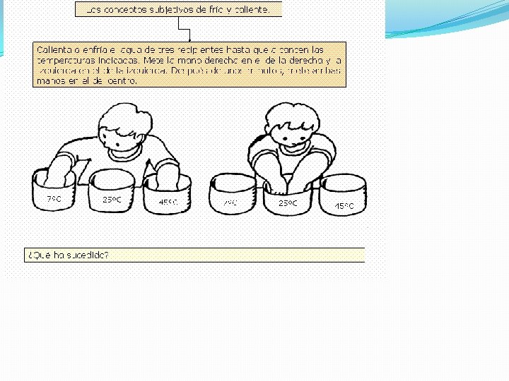 Transposición didáctica Con los ojos tapados pueden meter la mano derecha en un recipiente con el agua caliente , la mano izquierda en agua fría. Pasados varios minutos meten ambas manos en un recipiente con agua templada. ¿qué sensación tiene el niño? Medir la temperatura del agua de cada recipiente. Con un termómetro medir la temperatura en el exterior , al sol y a la sombra y apuntar los resultados. Medir la temperatura del agua del grifo, la del agua con hielos etc