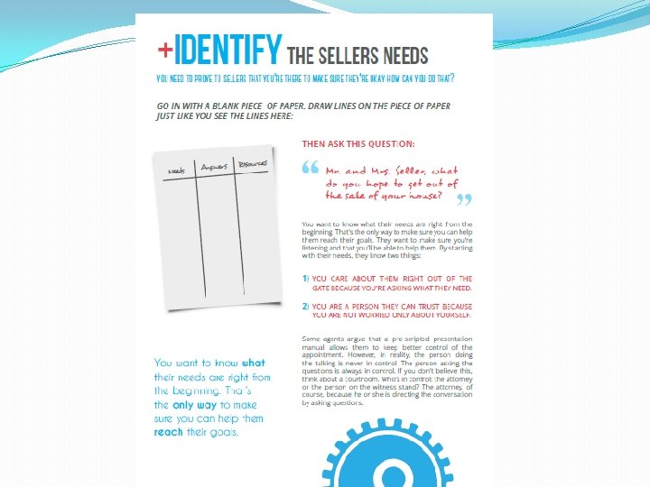 Identify Needs �You need to prove to Sellers that you’re there to make sure they’re OKAY! How can you do that? �You need to ASK the right questions! �By starting with THEIR needs, they know two things: � You care about them right out of the gate because you’re asking what they need. � Your are a person they can trust because you are not worried only about yourself.