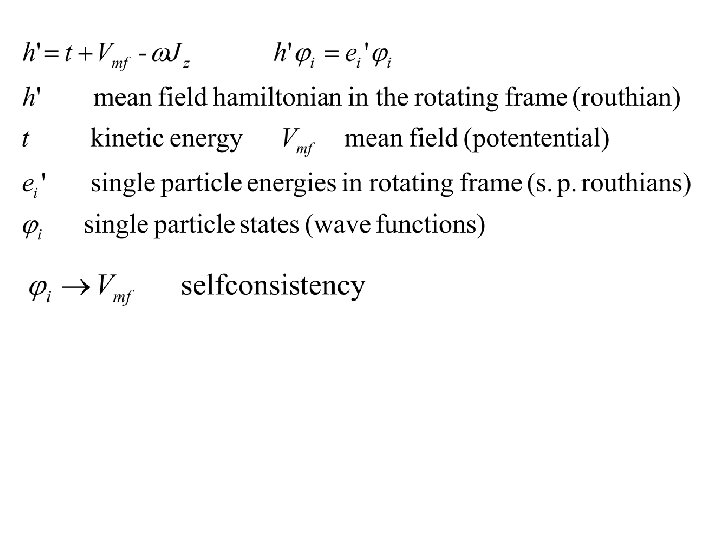 Cranking Model Seek a mean field solution carrying finite angular momentum. Use the variational principle with the auxillary condition The state |> is the stationary mean field solution in the frame that rotates uniformly with the angular velocity w about the z axis. In the laboratory frame it corresponds to a uniformly rotating mean field state