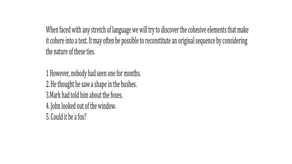 John looked out of the window. (situation) He thought he saw a shape in the bushes. (when you look out of the window you may see something) Could it be a fox? (making a hypothesis on the nature of the shape: from indefinite shape to definite object) Mark had told him about the foxes. (in favour of the fox hypothesis). However, nobody had seen one for ages (against the fox hypothesis). Relations between concepts can be made explicit by means of conjunctions