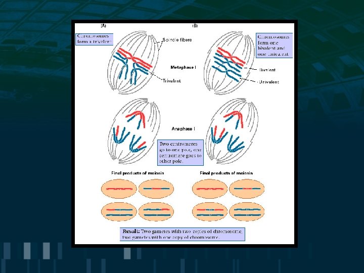 Reciprocal Translocations • Synapsis involving heterozygous reciprocal translocation results in pairing of four pairs of sister chromatids = quadrivalent • Chromosome pairs may segregate in several ways during meiosis, with varying genetic outcomes in gametes
