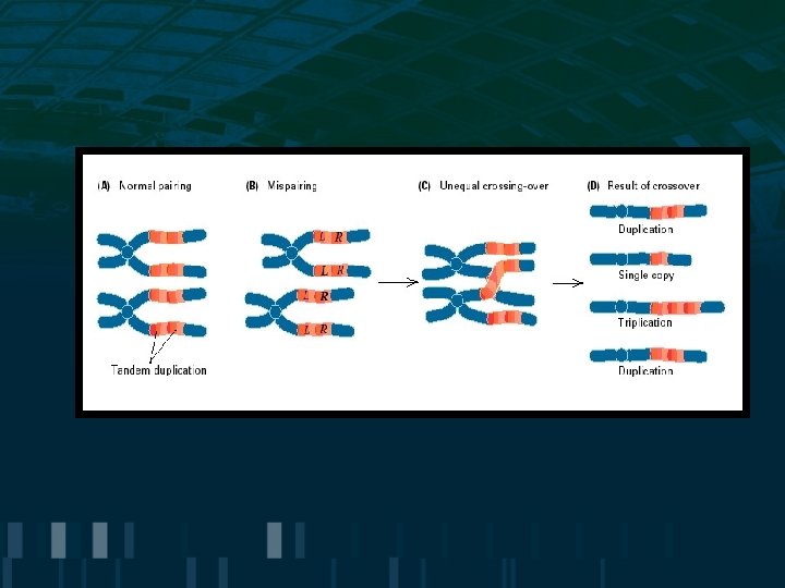 Gene Duplications • Duplication = chromosome segment present in multiple copies • Tandem duplications = repeated segments are adjacent • Tandem duplications often result from unequal crossing-over due to mispairing of homologous chromosomes during meiotic recombination