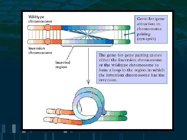 Chromosome Inversions • Inversions = genetic rearrangements in which the order of genes is reversed in a chromosome segment • Inversions do not alter the genetic content but change the linear sequence of genetic information • At synapsis = homologous pairing, inversion loops form