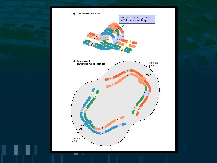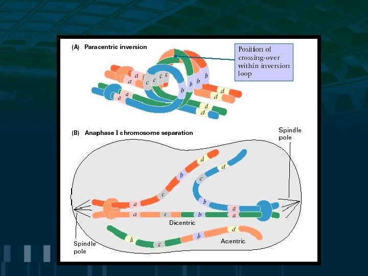 Chromosome Inversions • Paracentric inversion = does not include centromere; Pericentric inversion = includes centromere • Crossing-over within a paracentric inversion loop during recombination produces one acentric (no centromere) and one dicentric (two centromeres) chromosome