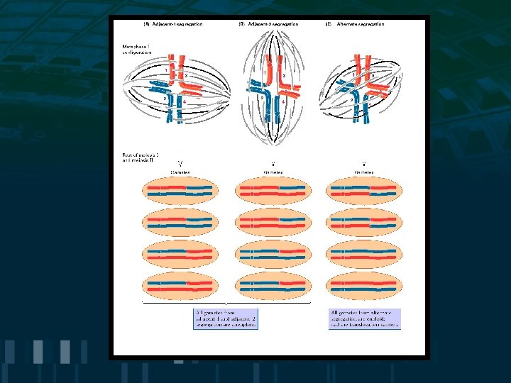 Reciprocal Translocation 3 outcomes of meiotic segregation: • Adjacent-1 segregation: homologous centromeres separate at anaphase I; gametes contain duplications and deletions • Adjacent-2 segregation: homologous centromeres stay together at anaphase I; gametes have a segment duplication and deletion