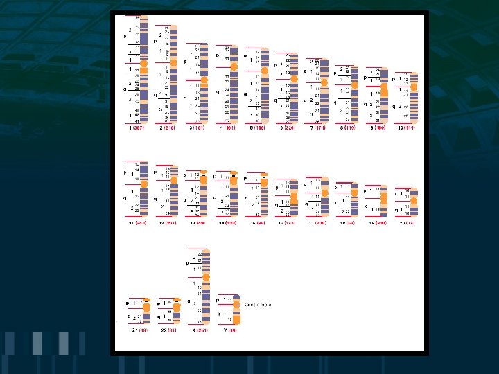 Human Chromosomes • Chromosome maps are prepared by dividing the chromosome into two regions (arms) separated by the centromere • p = short arm (petit); q = long arm • p and q arms are divided into numbered bands and interband regions based on pattern of staining
