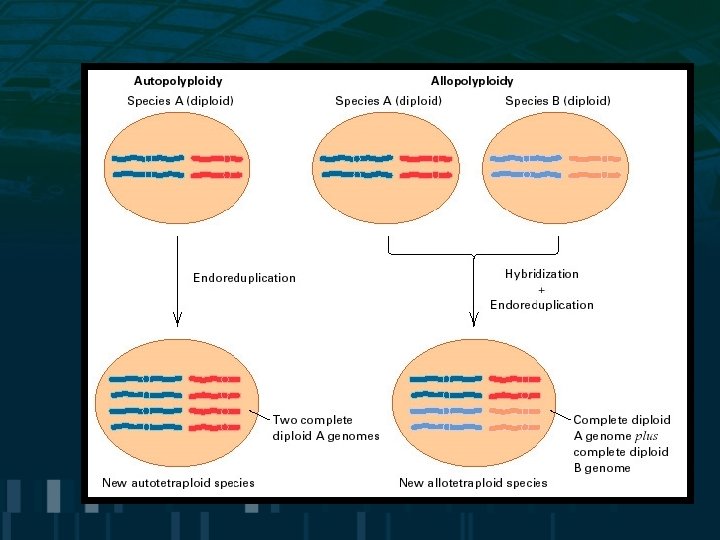 Endoreduplication • Endoreduplication= doubling of the chromosome complement • Tetraploidy=chromosomes fail to segregate during meiosis or mitosis • autopolyploidy=chromosomes derived from single diploid • Chromosome painting = chromosomes hybridized with fluorescent dye to show origins