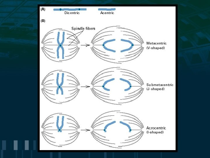 Centromeres may be located in different regions of a chromosome: • Metacentric = located in middle of chromosome • Submetacentric = located closer to one end of chromosome • Acrocentric = located near one end of chromosome