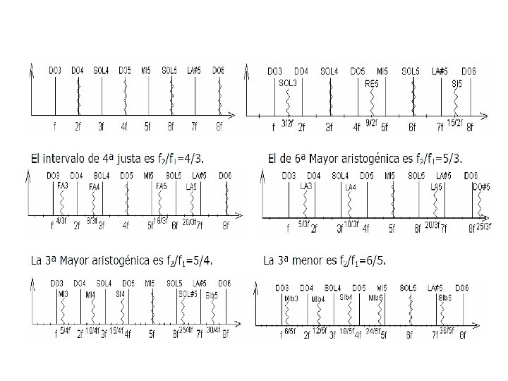 LAS ESCALAS MUSICALES EN LA TEORIA Y EN LA REALIDAD Sistema generativo de Pitágoras Esta afinación va muy bien si lo queremos interpretar es una melodía de tonos consecutivos, suena muy agradable al oído pero en el momento en que interpretamos algún tipo de armonía, si tocamos acordes, aparecen algunos problemas. En el acorde de 3ª M como vemos en el gráfico: la frecuencia del MI 2 respecto de la del DO 2 es de 81/64=1. 265625 esto hace que el cuarto armónico del MI 2, que será el MI 4=(81/64 f)x 4=5. 0625 f=330 Hz, no coincida con el quinto armónico del DO 2 que habrá de ser también el MI 4=5 f=325. 9 Hz. En este caso se escuchan algo más de cuatro batidos o pulsaciones. Esta pequeña diferencia entre los armónicos de una y otra nota es suficiente como para apreciar un número de batidos y vivenciar este acorde como desafinado mas aun si se interpreta en un instrumento de mecanismo mantenido como puede ser un órgano. Los músicos y científicos de la época se empeñaron en corregir este problema y surgieron así otros sistemas y escalas temperadas que corregían parte de los problemas, pero aparecían otros…