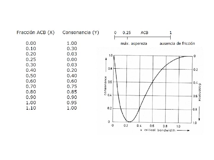 CONSONANCIA Y DISONANCIA Variación de la consonancia dentro de la ACB El hecho de que dos frecuencias separadas la ACB libren de asperezas o no es algo subjetivo. Para algunos músicos los tonos librarán y para otros no. Este limite es un poco ambiguo. Ahora vamos a ver que pasa cuando dos tonos están dentro de la ACB calculada. Cuando las dos frecuencias se encuentran a una distancia igual a un cuarto de la ACB considerada entonces la aspereza que se produce es máxima y va disminuyendo según se acercan los tonos hasta que coinciden. Plomp y su cuadrilla cuantificaron todos estos resultados en la siguiente tabla: