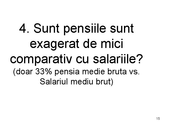 4. Sunt pensiile sunt exagerat de mici comparativ cu salariile? (doar 33% pensia medie bruta vs. Salariul mediu brut) 15
