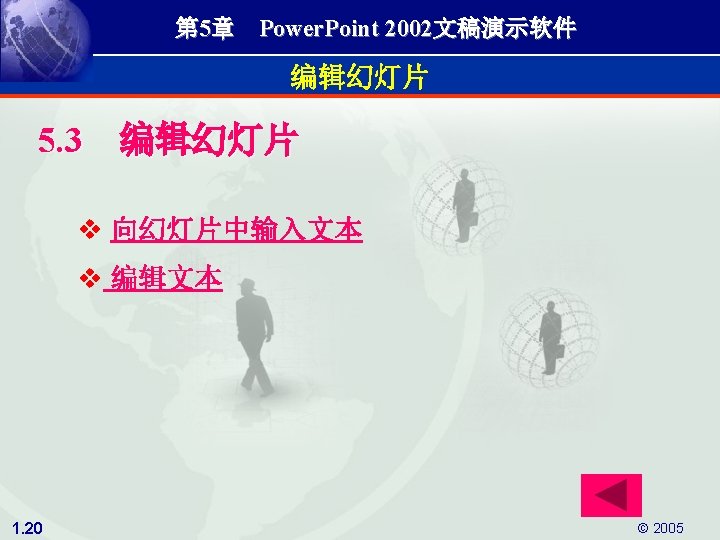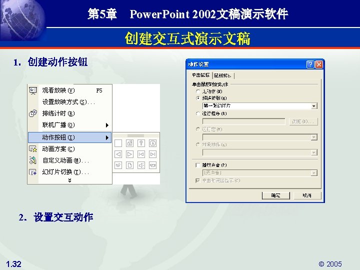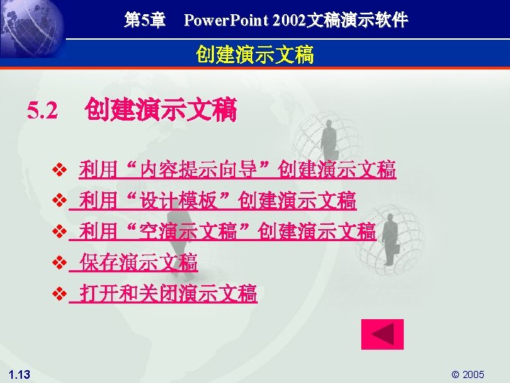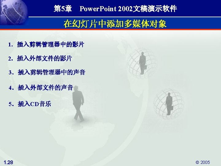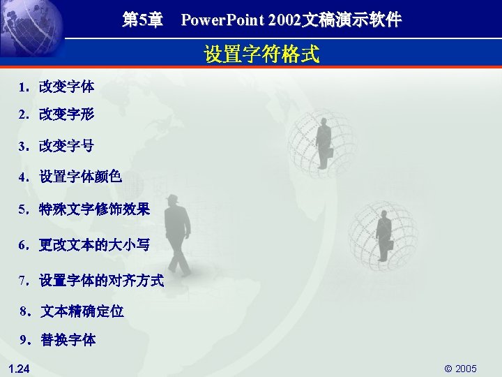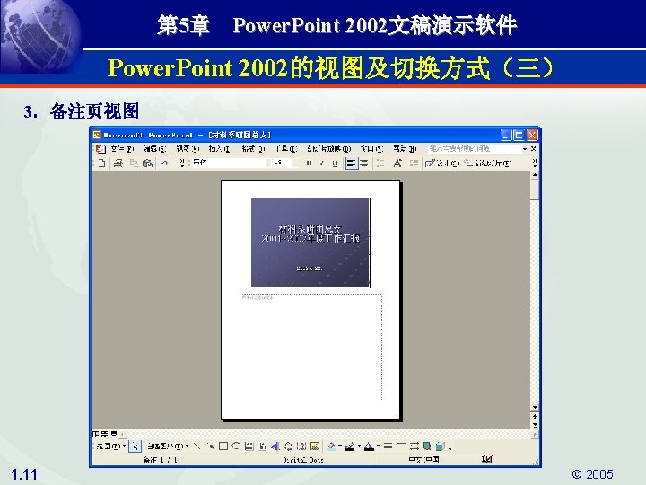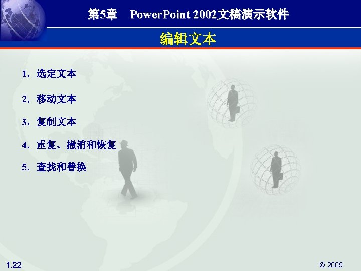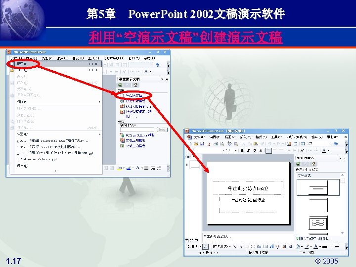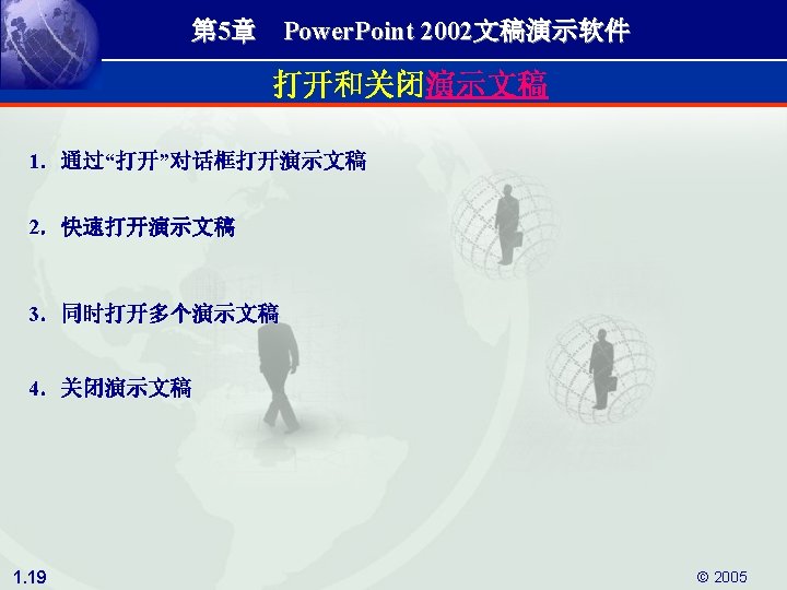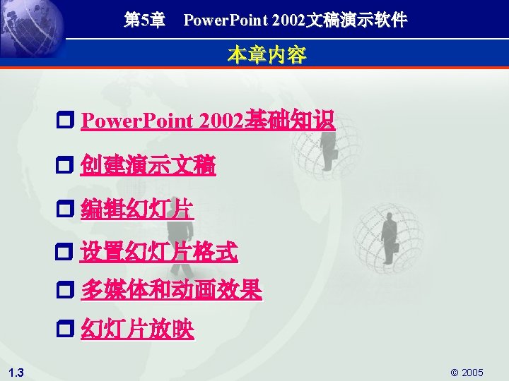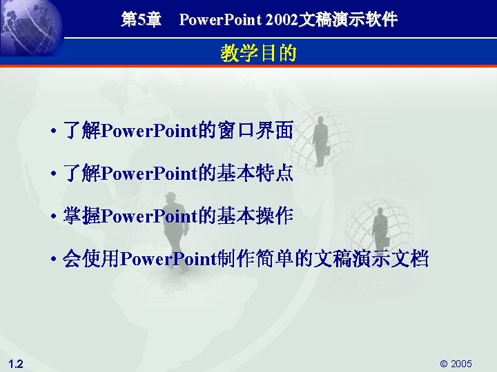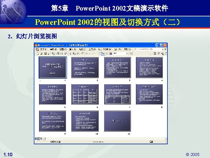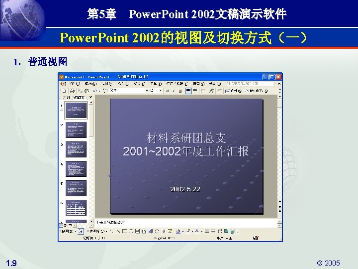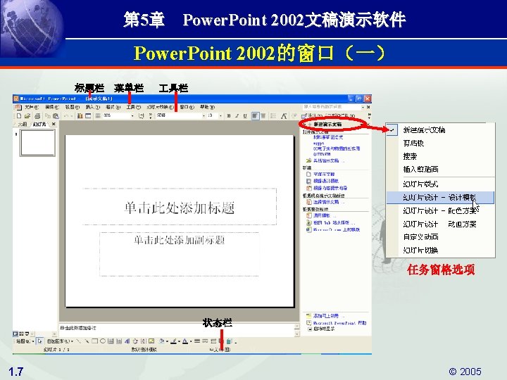 5 Power Point 2002 Power Point 2002 5 Slides: 34 Download presentation 第 5章 Power. Point 2002文稿演示软件 Power. Point 2002基础知识 5. 1 Power. Point 2002基础知识 v Power. Point 2002的新特性 v Power. Point 2002的启动和退出 v Power. Point 2002窗口 v Power. Point 2002视图及切换方式 1. 4 © 2005