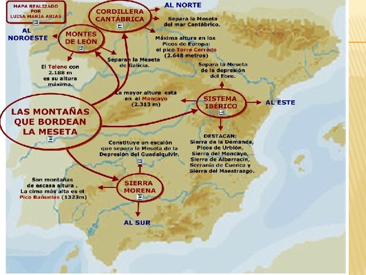 CORDILLERAS QUE BORDEAN LA MESETA: Montes de León: Sierra de Teleno (Teleno 2. 188 mts) � Sierra de Segundera � Cordillera Cantábrica: Picos de Europa (Torrecerredo) � � Sistema Ibérico: picos de Urbión Sierra de Moncayo (Moncayo 2. 314 mts) Sierra de Albarracín � Sierra Morena: Aracena , Madrona y Hornachuelos.