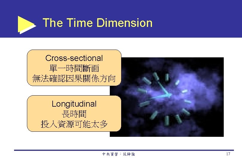 Descriptors of Research Design Perceptual Awareness Purpose of Study Research Environment Question Crystallization Descriptors Topical Scope 中央資管:范錚強 Data Collection Method Experimental Effects Time Dimension 5