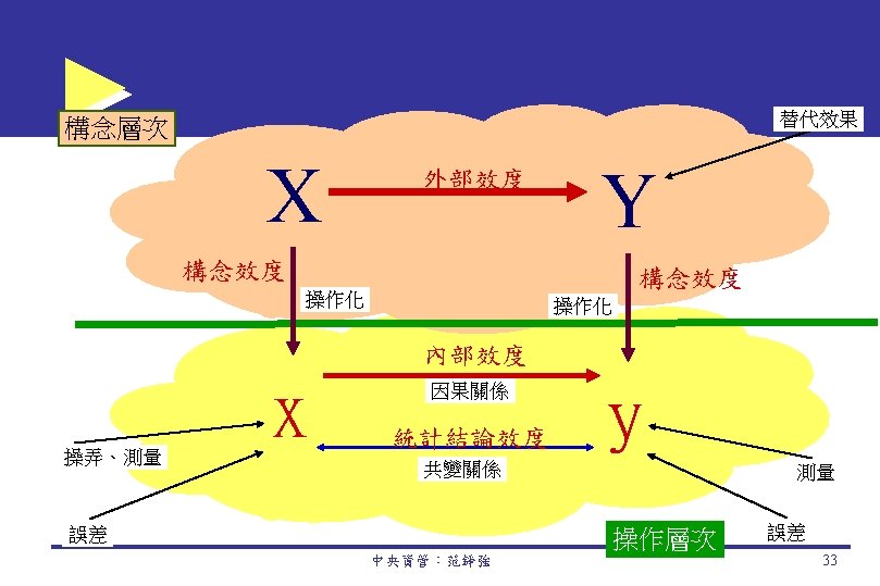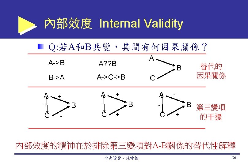 Evidence of Causality Covariation between A and B Time order of events No other possible causes of B 中央資管:范錚強 31