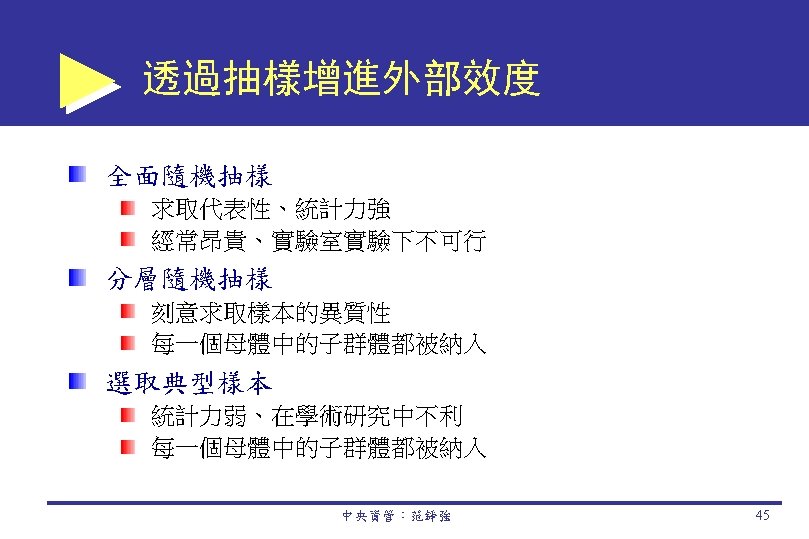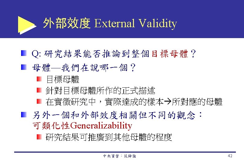 Degree of Question Crystallization Exploratory Study Formal Study Loose structure Precise procedures Expand understanding Begins with hypotheses Provide insight Answers research questions Develop hypotheses 中央資管:范錚強 8