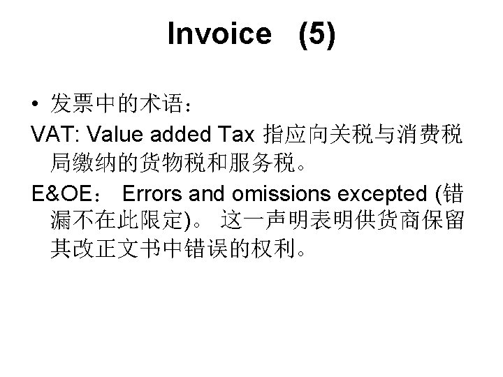 Invoice (1) • • • 更正发票 合并发票 预付发票 租用发票 税务发票 自用发票 代理发票 租赁发票 寄售发票 corrected invoice consolidated invoice prepayment invoice hire invoice tax invoice self-billed invoice factored invoice lease invoice consignment invoice