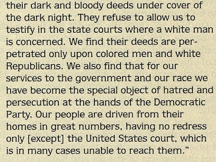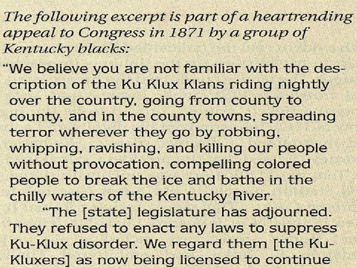 Spreading Terror v v The Ku Klux Klan The Klan sought to eliminate the Republican Party in the South by intimidating voters. They wanted to keep African Americans as submissive laborers. They planted burning crosses on the lawns of their victims and tortured, kidnapped, or murdered them. Prosperous African Americans, carpetbaggers, and scalawags became their victims. The Federal Response v President Grant’s War On Terrorism. v The Enforcement Act of 1870 banned the use of terror, force, or bribery to prevent people from voting. v Other laws banned the KKK and used the military to protect voters and voting places. v As federal troops withdrew from the South, black suffrage all but ended.