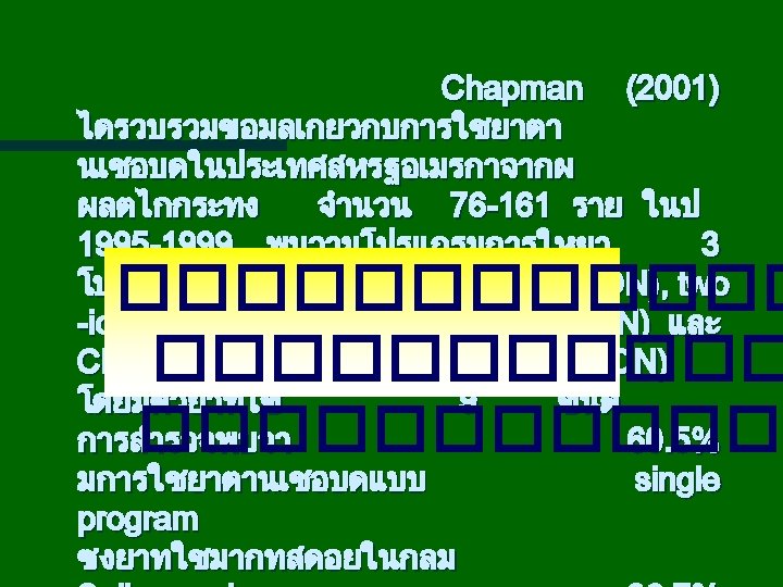 Table 1. Tolerance level and withdrawal period for anticoccidial drugs in chickens ________________________________ Drug ������������ �� ���� Win 98, Win 2000, Win ME, Win XP Approved category Withdrawal period Tolerance Target tissue concentration (ppm) (day) level (ppm)1 Amprolium 125 -250 ll 0 0. 5 muscle Clopidol 125 or 250 ll 5 5 Decoquinate 30 l 0 1 muscle Halofuginone 3 ll 4 0. 16 liver Lasalocid 75 -125 l 0 0. 3 Maduramicin 5 or 6 ll 5 0. 24 muscle Monensin 99 -121 l 0 0 Narasin 60 -80 l 0 0 Maxiban 60 -99 ll 5 0/4 Nicarbazin 125 ll 4 4 muscle Robenidine 33 ll 5 0. 1 muscle Salinomycin 44 -66 l 0 0 Semduramicin 25 l 0 0 Zoalene 125 l 0 3 ________________________________1 Concentration of a residue in the target tissue ����� : ����� Chapman (2002( ทำใหไมตรงสดมภ muscle skin/fat -/muscle