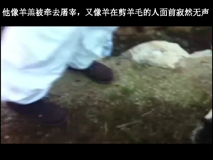 众立 赛 53: 7 他被虐待【欺压】,受痛苦的时候,他并不开口;他像羊 羔被牵去屠宰,又像羊在剪羊毛的人面前寂然无声,他也是这样不 开口。8 他受拘禁【欺压】和审判以后被带走;至于他那个世代的 人中,有谁想到从活人之地被剪除,被击打,是因我子民的过犯呢 ? 9 虽然他从来没有行过强暴,他的口里也没有诡 诈,人还是使他与恶人同埋,但死的时候与财主同葬。 Isa 53: 7 He was oppressed, and he was afflicted, yet he opened not his mouth; like a lamb that is led to the slaughter, and like a sheep that before its shearers is silent, so he opened not his mouth. 8 By oppression and judgment he was taken away; and as for his generation, who considered that he was cut off out of the land of the living, stricken for the transgression of my people? 9 And they made his grave with the wicked and with a rich man in his death, although he had done no violence, and there was no deceit in his mouth. 宣招 1/2