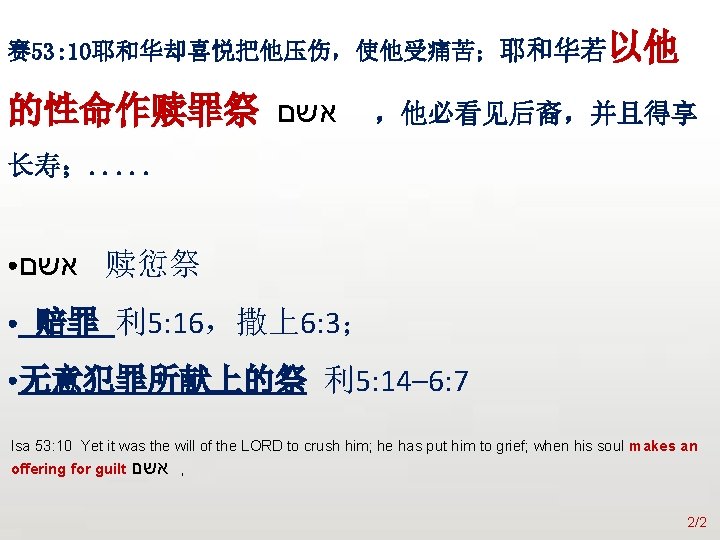 众立 赛 53: 10 耶和华却喜悦把他压伤,使他受痛苦;耶和华若 以他的性命作赎罪祭 אשם ,他必看见后裔,并且得享长寿;耶和 华所喜悦的,必在他手中亨通。11他受了生命之苦以后,必看见光 明,并且心满意足;我的义仆必使许多人因认识他而得称为义,他 也必背负他们的罪孽。12所以,我要使他与伟大的人同分,他必与 强盛的均分掳物,因为他把自己的性命倾倒,以致于死。他被列在 罪犯之中,却担当了多人的罪,又为罪犯代求。 Isa 53: 10 Yet it was the will of the LORD to crush him; he has put him to grief; when his soul makes an offering for guilt, he shall see his offspring; he shall prolong his days; the will of the LORD shall prosper in his hand. 11 Out of the anguish of his soul he shall see and be satisfied; by his knowledge shall the righteous one, my servant, make many to be accounted righteous, and he shall bear their iniquities. 12 Therefore I will divide him a portion with the many, and he shall divide the spoil with the strong, because he poured out his soul to death and was numbered with the transgressors; yet he bore the sin of many, and makes intercession for the transgressors. 宣招 2/2