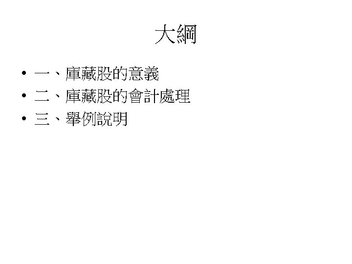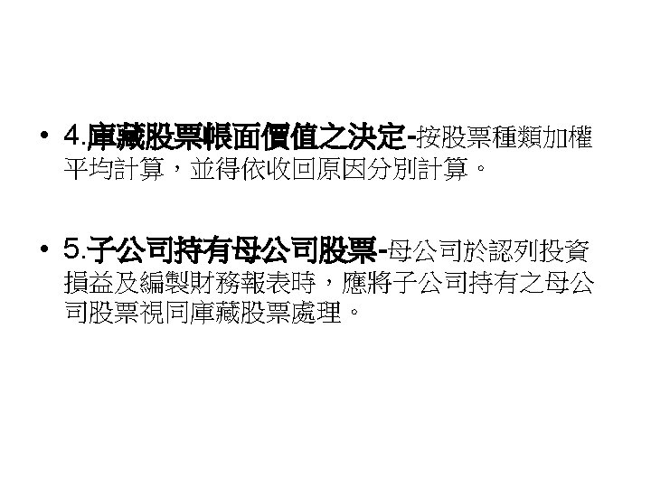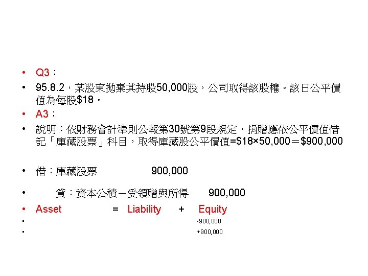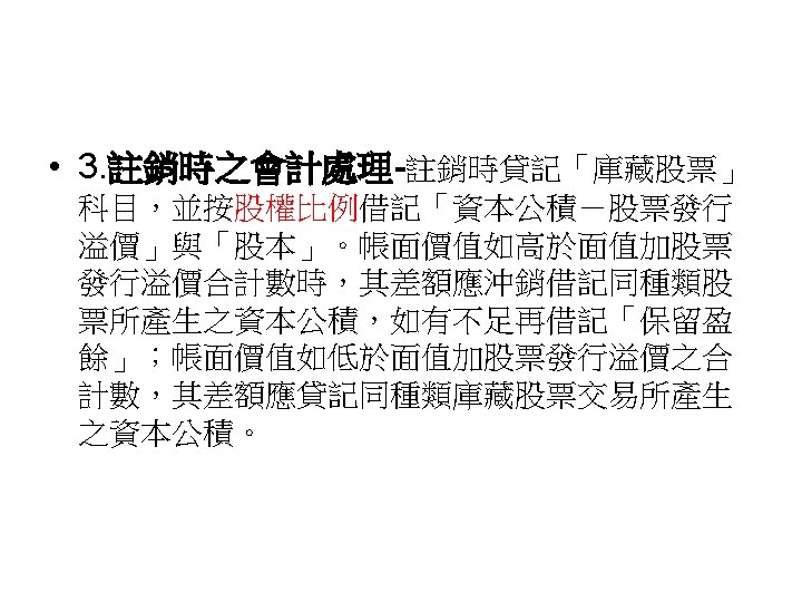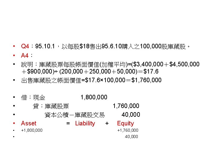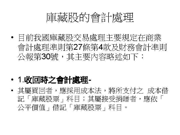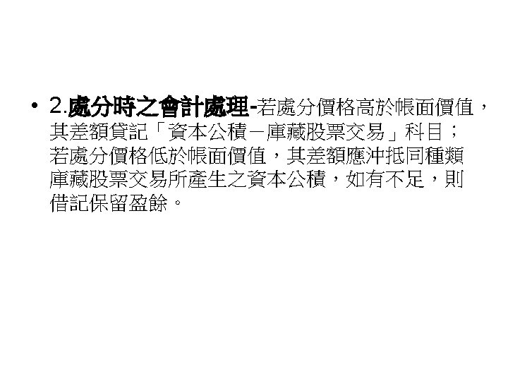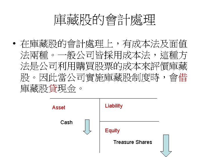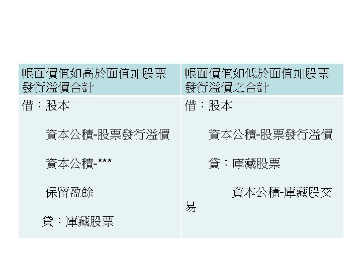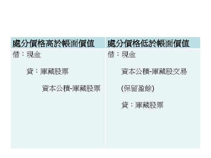 530 50 000 530 4 000 50 0 Slides: 25 Download presentation 股本 資本公積-股票發行溢價 5/30 50, 000 5/30 4, 000 50, 0 00, 000 4, 000 庫藏股 保留盈餘 5/30 8, 000, 000 6/10 3, 400, 000 股本 資本公積-股票發行溢價 5/30 50, 000 5/30 4, 000 50, 0 00, 000 4, 000 保留盈餘 5/30 庫藏股 8, 000 6/10 3, 400, 000 8/1 4, 500, 000 8, 000 7, 900, 000 股本 資本公積-股票發行溢價 5/30 50, 000 5/30 4, 000 50, 0 00, 000 4, 000 庫藏股 保留盈餘 5/30 8, 000, 000 6/10 3, 400, 000 8/1 4, 500, 000 8/2 900, 000 8, 800, 000 資本公積-受領贈與所得 8/2 900, 000 股本 資本公積-股票發行溢價 5/30 50, 000 5/30 4, 000 50, 0 00, 000 4, 000 保留盈餘 5/30 庫藏股 8, 000, 000 6/10 3, 400, 000 8/1 4, 500, 000 8/2 900, 000 10/1 1, 760, 000 7, 040, 000 資本公積-受領贈與所得 8/2 900, 000 資本公積-庫藏股交易 10/1 40, 000 股本 12/15 1, 500, 000 資本公積-股票發行溢價 5/30 50, 000 12/15 120, 000 5/30 4, 000 48, 5 00, 000 3, 880, 000 保留盈餘 10/15 80, 000 5/30 庫藏股 8, 000 7, 920, 000 6/10 3, 400, 000 8/1 4, 500, 000 8/2 900, 000 10/1 1, 760, 000 10/15 2, 640, 000 4, 400, 000 資本公積-受領贈與所得 10/15 900, 000 8/2 0 900, 000 資本公積-庫藏股交易 10/15 40, 000 10/1 0 40, 000 • 借:現金 3, 750, 000 • 保留盈餘 650, 000 • 貸:庫藏股票 4, 400, 000 • Asset = Liability + Equity • • +3, 750, 000 -650, 000 +4, 400, 000 股本 12/15 1, 500, 000 資本公積-股票發行溢價 5/30 50, 000 12/15 120, 000 5/30 4, 000 48, 5 00, 000 3, 880, 000 保留盈餘 10/15 80, 000 10/31 650, 000 5/30 庫藏股 8, 000 7, 270, 000 6/10 3, 400, 000 10/1 1, 760, 000 8/1 4, 500, 000 12/15 2, 640, 000 8/2 900, 000 12/31 4, 400, 000 0 資本公積-受領贈與所得 10/15 900, 000 8/2 0 900, 000 資本公積-庫藏股交易 10/15 40, 000 10/1 0 40, 000