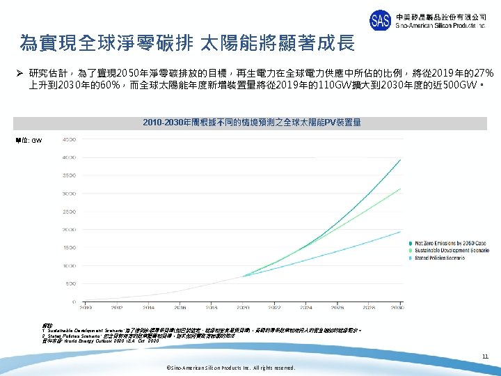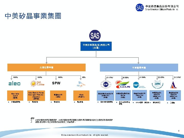 Disclaimer This presentation has been prepared by Sino-American Silicon Products Inc. (the “Company”). This presentation and the materials provided herewith do not constitute an offer to sell or issue or the solicitation of an offer to buy or acquire securities of the Company in any jurisdiction or an inducement to enter into investment activity, nor may it or any part of it form the basis of or be relied on in connection with any contract or commitment whatsoever. Any decision to purchase securities in a proposed offering should be made solely on the basis of the information contained in the offering circular published in relation to such proposed offering, if any. The information contained in this presentation has not been independently verified. No representation, warranty or undertaking, express or implied, is made as to, and no reliance should be placed on, the fairness, accuracy, completeness or correctness of the information or the opinions contained herein. The information contained in this document should be considered in the context of the circumstances prevailing at the time and has not been, and will not be, updated to reflect material developments which may occur after the date of the presentation. None of the Company nor any of its affiliates, advisors or representatives will be liable (in negligence or otherwise) for any loss howsoever arising from any use of this presentation or its contents or otherwise arising in connection with the presentation. 1 ©Sino-American Silicon Products Inc. All rights reserved.