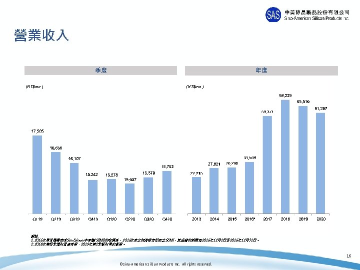 財務摘要: 2020年 vs. 2019年 2020 2019 年成長率 營業收入 61, 397 65, 510 -6. 3% EBITDA*1 22, 232 18, 668 19. 1% EBITDA % 36. 2% 28. 5% 7. 7% EBIT 16, 084 12, 049 33. 5% 營業淨利 14, 932 13, 515 10. 5% 營業淨利 % 24. 3% 20. 6% 3. 7% 本期淨利 12, 711 8, 895 42. 9% 本期淨利 % 20. 7% 13. 6% 7. 1% NT$10. 82 NT$3. 86 NT$6. 96 股東權益報酬率 /ROE*2 (年化) 25. 9% 18. 4% 7. 4% 資產報酬率 /ROA*3(年化) 11. 6% 8. 5% 3. 2% (NT$mn) 每股盈餘 備註: 1. EBITDA=本期淨利+折舊費用+攤銷費用+利息+所得稅 2. ROE = 本期淨利/股東平均權益 3 3. ROA = ((本期淨利+利息*(1 -有效稅率))/平均資產 15 ©Sino-American Silicon Products Inc. All rights reserved.