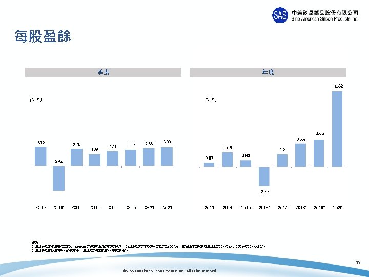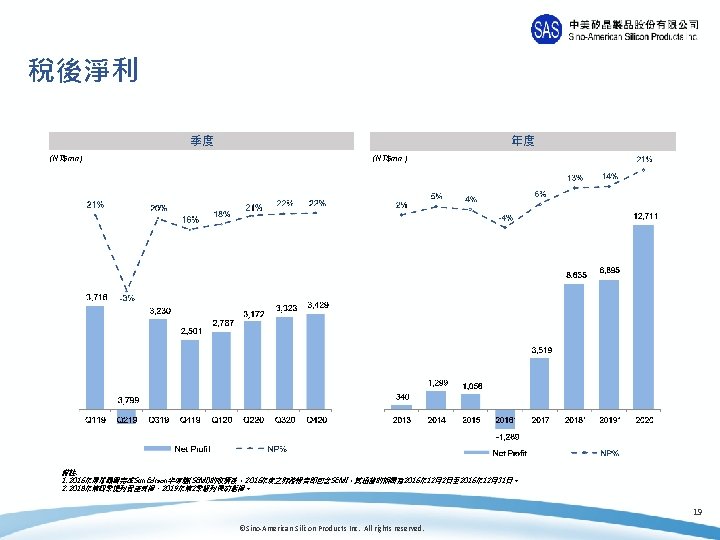 營業利益 季度 年度 (NT$mn ) (NT$mn) 24% 29% 25% 27% 24% 19% 26% 21% 3% 5 064 5% 21% 11% 8% 14 932 13 178 13, 515 0% 4% 4 038 4 082 3 747 3 977 3 706 3 212 6 325 2 237 4 973 1 447 629 Q 119 Q 219* Q 319 Q 419 Operating Profit Q 120 Q 220 Q 320 Q 420 2013 42 2014 OP% 2015 2016* 2017 Operating Profit 2018* 2019* 2020 OP% 備註: 1. 2016年環球晶圓完成Sun. Edison半導體(SEMI)的收購後,2016年度之財務報告即包含SEMI,其涵蓋的期間為 2016年 12月2日至 2016年 12月31日。 2. 2018年第四季提列資產減損、2019年第 2季認列長約虧損。 18 ©Sino-American Silicon Products Inc. All rights reserved.